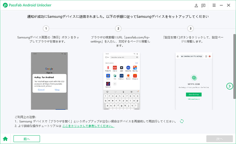 まず紹介するのは専門ソフトを使う方法です。PassFab Android UnlockはAndroid 画面ロックとSamsung FRP ロック削除用の2-in-1ツールで、アンドロイドの画面ロックを解除できるだけでなく、Googleアカウントのパスワードを入力することなくワンクリックでグーグルアカウントを削除することもできます。SamsungデバイスのGoogleアカウント削除をサポートし、画面上に表示されるガイドに従って操作するだけでAndroidからGoogleアカウントを削除できる簡単な方法です。