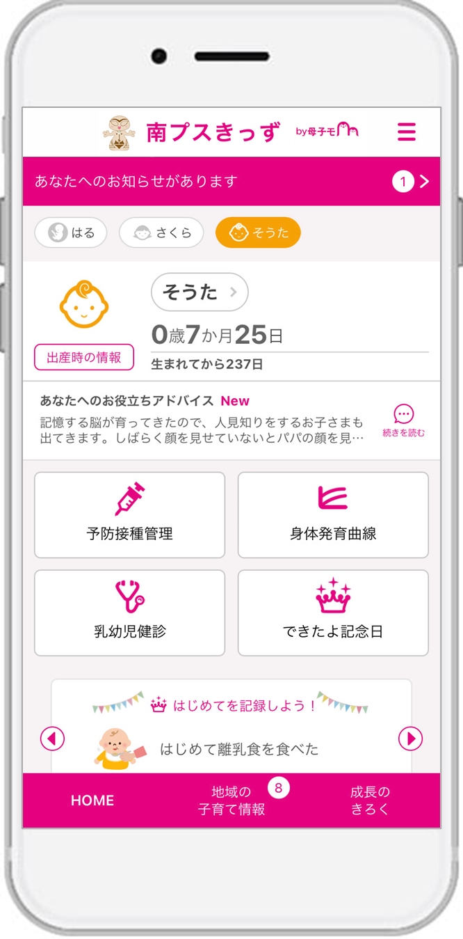山梨県南アルプス市に採用された『南プスきっず』は、スマートフォン・タブレット端末・PCに対応したサービスで、妊産婦と子どもの健康データの記録・管理や予防接種のスケジュール管理、出産・育児に関するアドバイスの提供、離れた地域に住む祖父母など家族との共有機能や、市が配信する地域の情報をお知らせするなど、育児や仕事に忙しい母親や父親を助けてくれる便利な機能が充実しています。