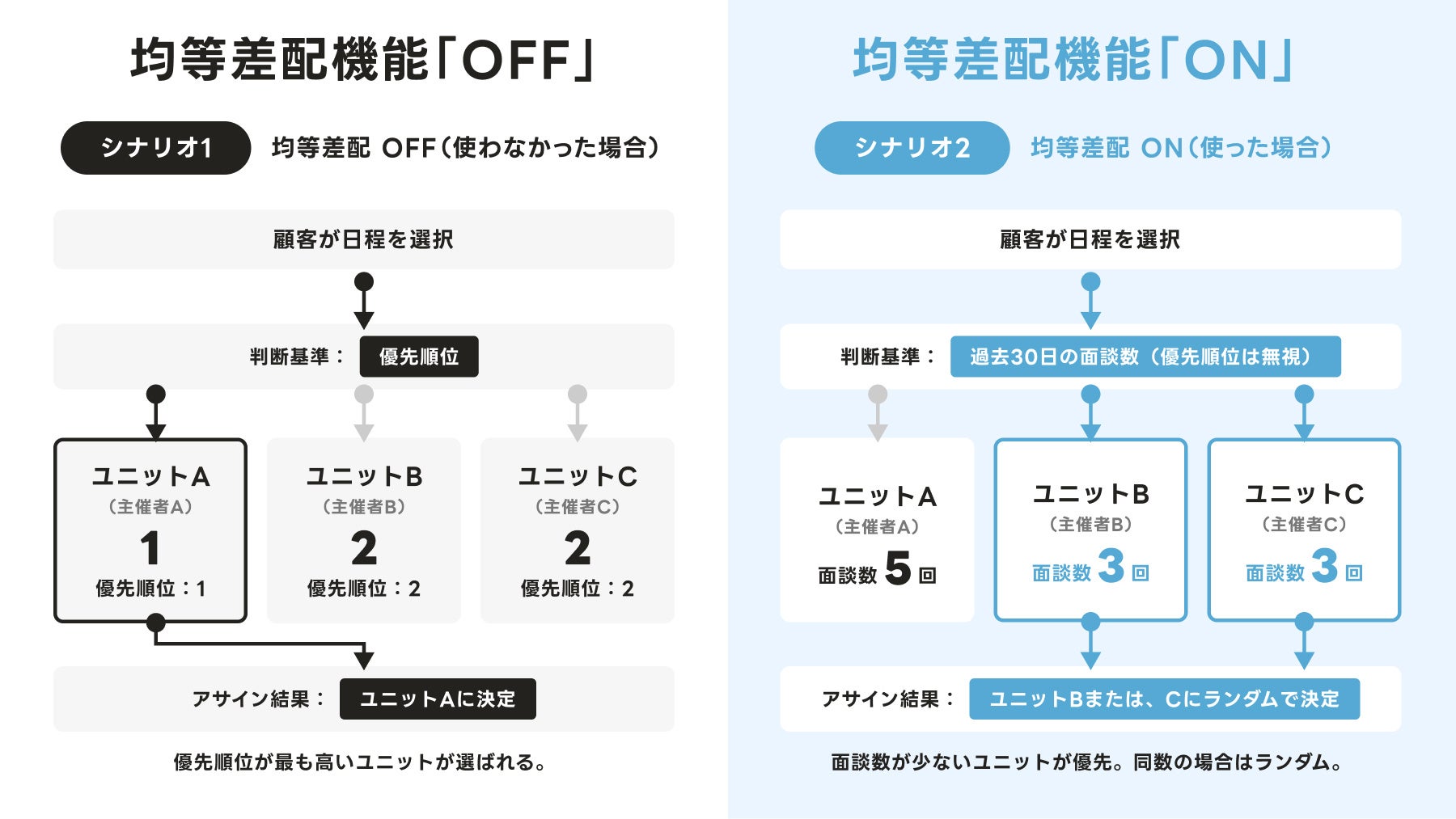 「均等差配」は、商談予約時に直近30日間の面談件数をもとに、ユニットを自動選択する差配ロジックです。本機能を有効にすると、面談件数が最も少ない主催者を含むユニットが優先的に選択され、面談件数が同数の場合はランダムでユニットが決定されます。