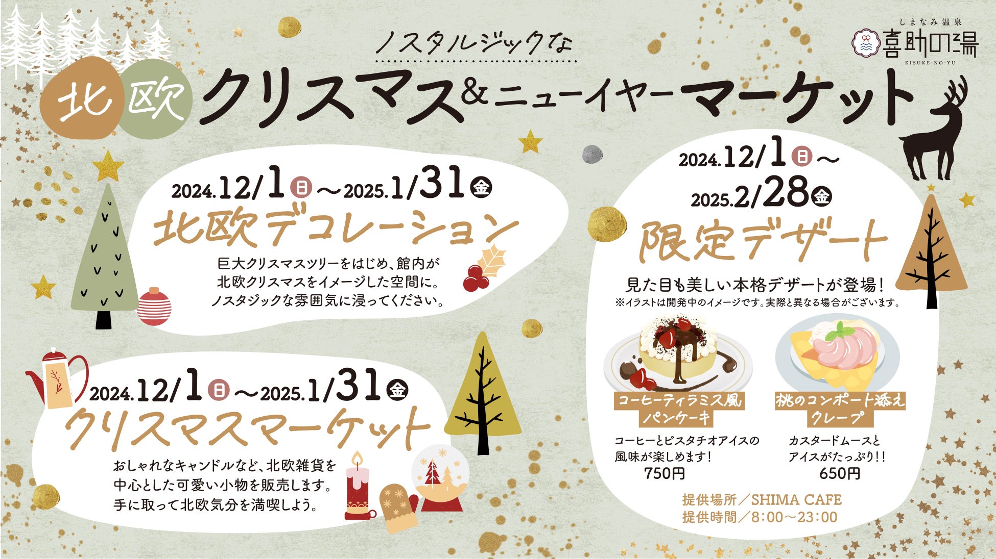 【喜助の湯】しまなみの温泉が北欧のクリスマスに変身!クリスマスマーケットや限定デザートで心温まるひとときを【愛媛県 今治市】