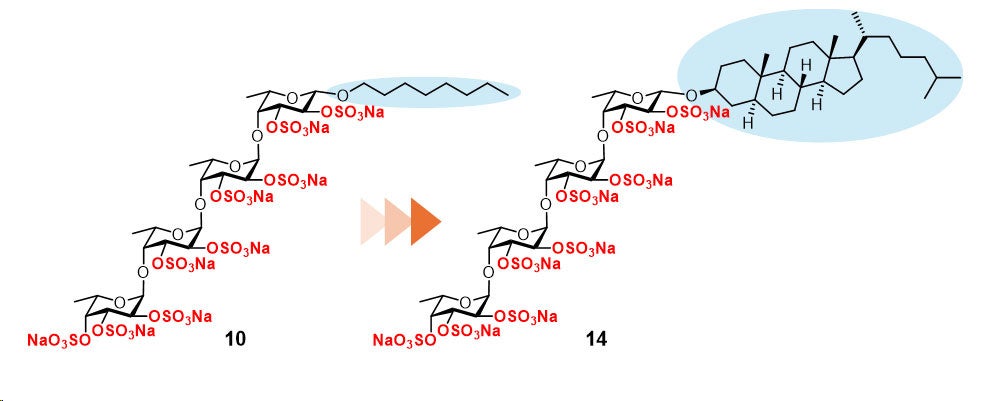 天然由来フコイダンがSARS-CoV-2の感染阻害活性を発現することは報告されていましたが、構造が不均一な多糖であるために、どの部分構造が活性発現に重要かが判明していませんでした。本研究グループは、これまでに硫酸化パターンと糖鎖構造が種々異なる13種類の硫酸化四糖(フコイダン類縁体)を化学合成し、SARS-CoV-2の表面抗原であるスパイクタンパク質に対して結合活性が高い類縁体を見出していました。本研究では、見出していた類縁体のうち、アグリコン構造をオクチル基からコレスタニル基に変更した新規類縁体が、スパイクタンパク質に対して高い結合活性を発現することを明らかにしました。さらに、本類縁体は、COVID-19の重症度と相関して発現レベルが上昇するヘパラナーゼの活性も阻害することを突き止めました。加えて、本類縁体がCOVID-19パンデミック発生当初の武漢株だけでなく、オミクロン株BA.2及びBA.5といった変異株の感染も抑制することを見出しました。以上のことから、今後、様々な変異株に有効かつ重症化を抑える新たなCOVID-19治療薬の開発への寄与が期待されます。