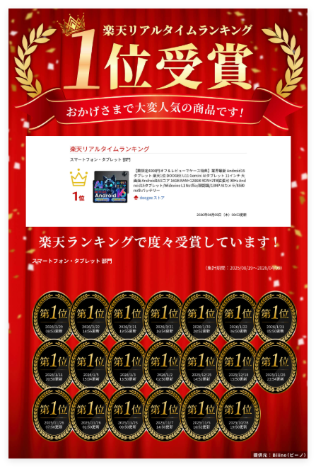 さらに、本製品はタブレットカテゴリにおいて売上ランキング1位を何度も獲得しており、安定した人気と実績を誇ります。
