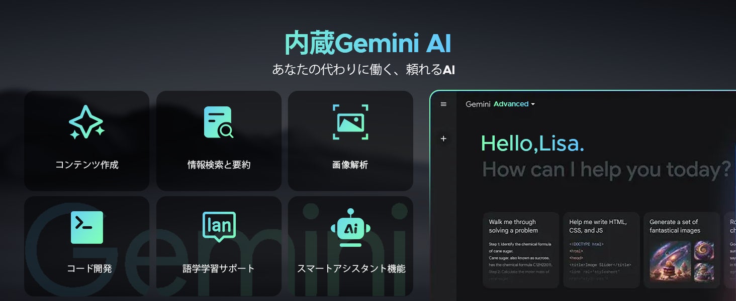本製品は最新のAndroid16を搭載し、さらにGemini AI機能を内蔵。
