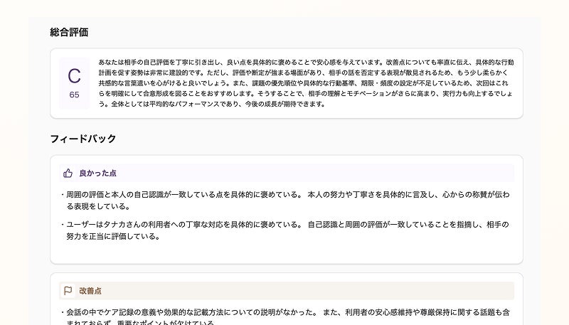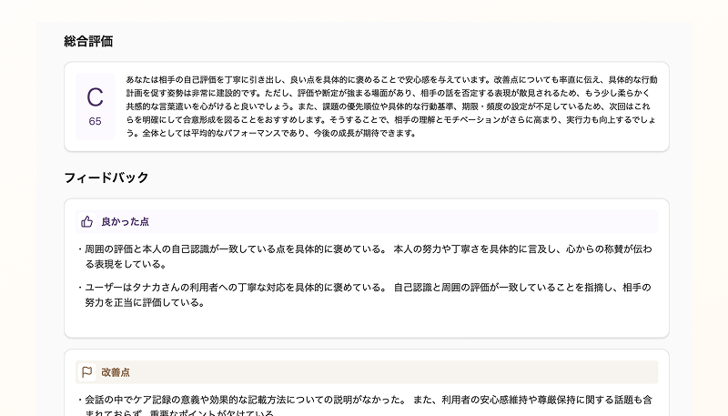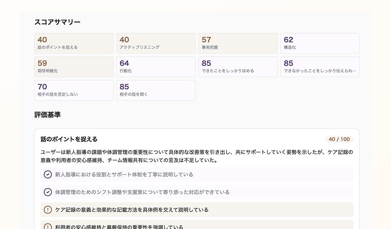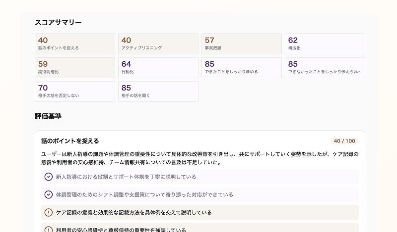 ロープレ実施後にAIが自動で生成する評価レポートでは、設定されたすべての評価基準に基づく総合点・総評と、評価基準ごとの評点・コメントが表示されます。