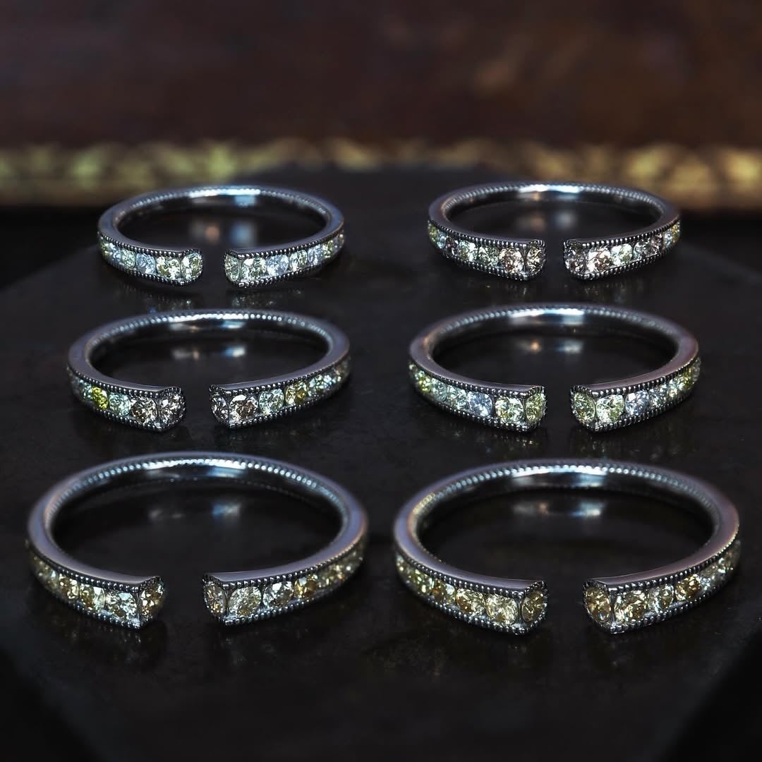 ホワイト、イエロー、シャンパン、ゴールデンなど、ダイヤモンドが持つ幅広い色合いを繊細に組み合わせ、一点ごとに異なる表情を持たせています。配色や石の配置はすべて異なり、それぞれが唯一無二の仕上がりとなっております。