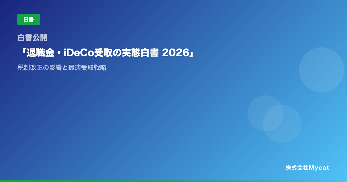 株式会社Mycat(本社:東京都目黒区)は、「退職金・iDeCo受取の実態白書 2026」を無料公開しました。退職金・iDeCoの受取方法に関する制度の現状と、2026年税制改正の影響を体系的にまとめた資料です。