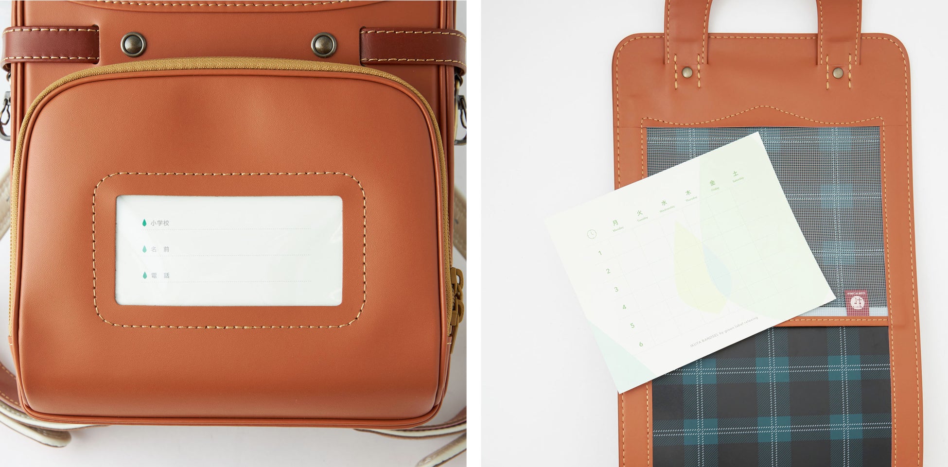 背裏と開閉部分に各ブランドネームの刻印を入れ、GLRのブランドアイコンをモチーフにしたオリジナルの時間割とお名前カードをセットにしました。