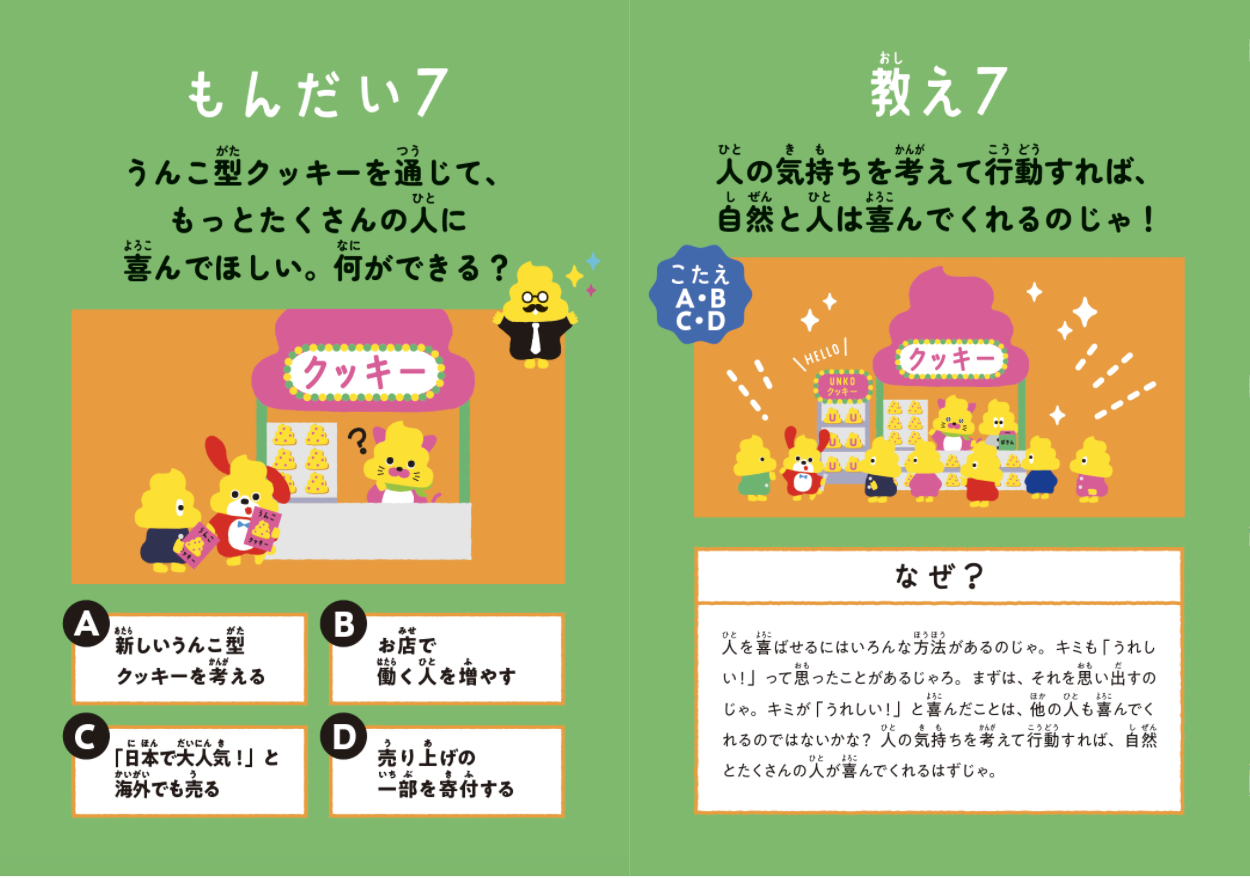 問題は、生活編・経済編それぞれ全7問が収録されており、4つの選択肢から回答を選んでいく形式。選択肢にはかならずうんこネタが登場し、くすっと笑いながら解き進めていくことができます。「うんこ(誤答)」をうっかり選択してしまっても、次のページでうんこ先生からの教えと解説を読めば、正しいお金の知識を学べるようになっています。