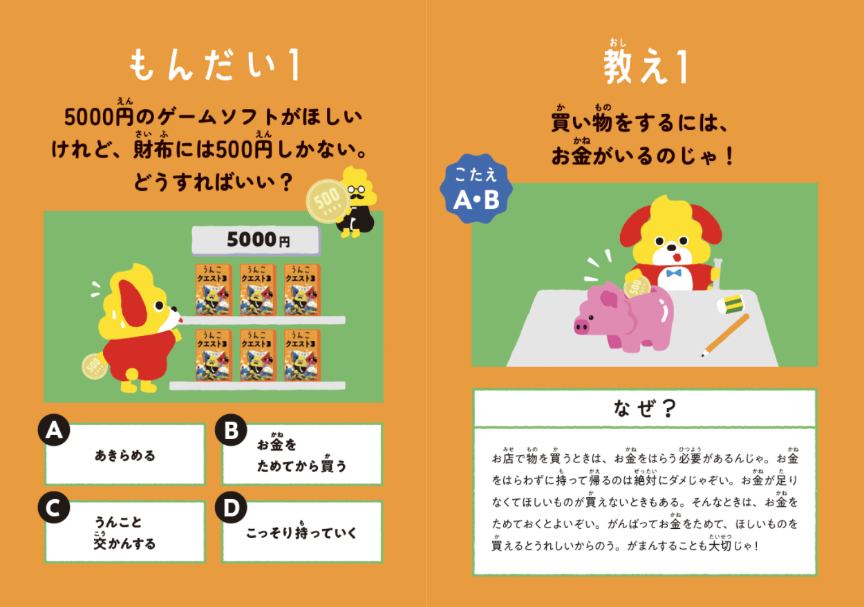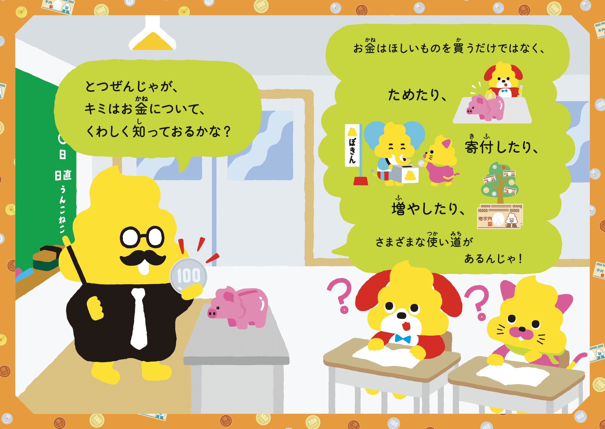 表紙をめくると、おなじみの‘うんこ先生’が登場。うんこ学園のキャラクターである‘うんこね’こや‘うんこいぬ’が、「買い物に行く」「自分でお菓子屋をつくって商売する」「貯金する」「寄付する」「投資する」などのケーススタディーを通して、お金の基本について学べる構成になっています。