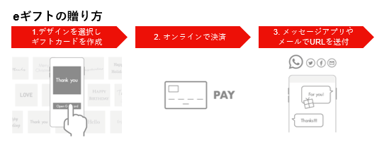 購入者は、発行されたeギフトにデジタルのメッセージカードを添えて、ご友人やご家族などにメールやSMS、Whatsappなどを介し、即時に贈ることができます。eギフトを受け取られた方は、スマートフォンのeギフト受取り画面を店頭で表示することで、ご飲食時の代金としてご利用いただくことが可能です。なお、eギフトは、店頭にてPOSによりeギフト表示画面を読み込むことで決済が実行されます。
