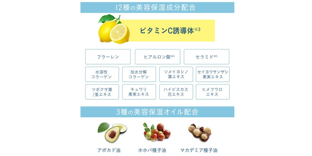 ※1 冷感により肌がひきしまること ※2 メイクアップ効果による ※3 リン酸アスコルビルMg(保湿成分) ※4 ヒアルロン酸Na ※5 グルコシルセラミド