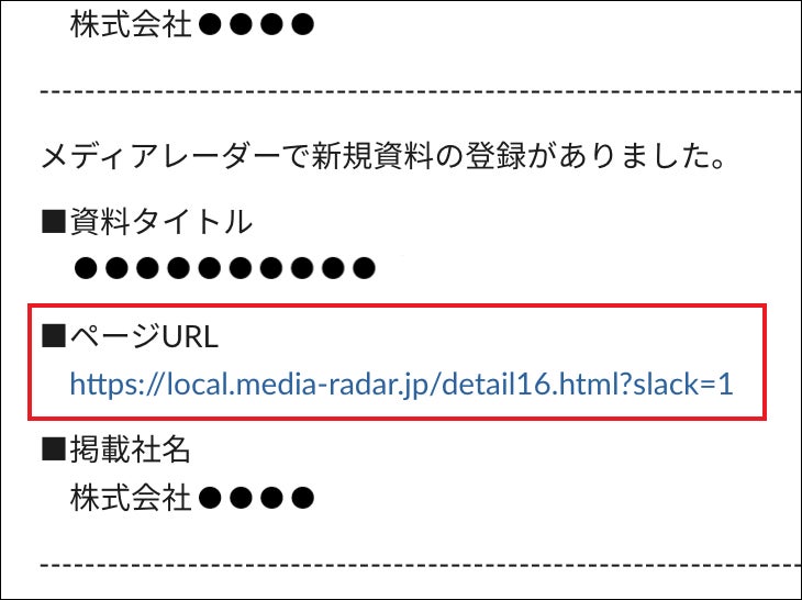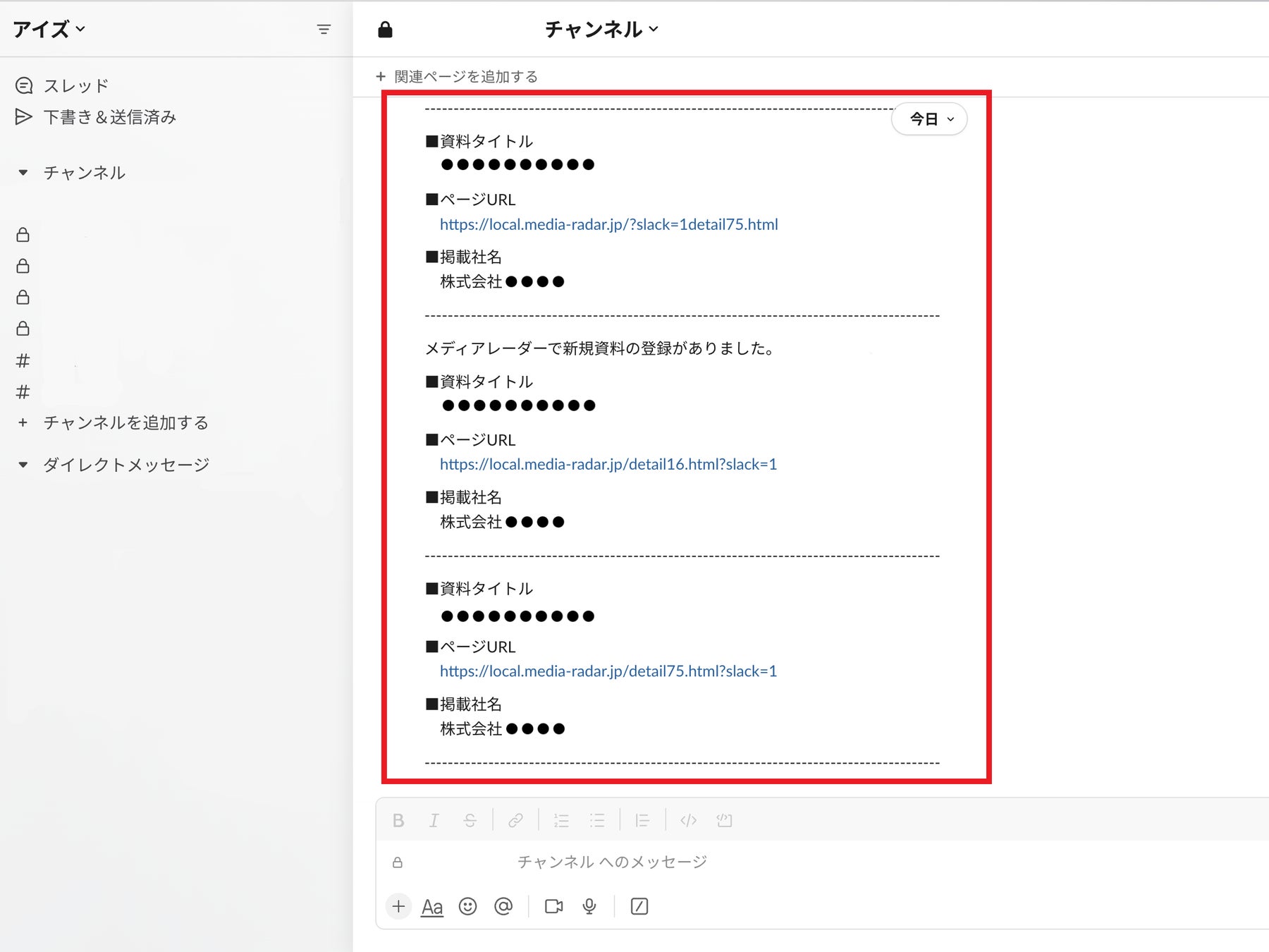 指定したslack内のチャンネルにメディアレーダーから資料通知が届きます。