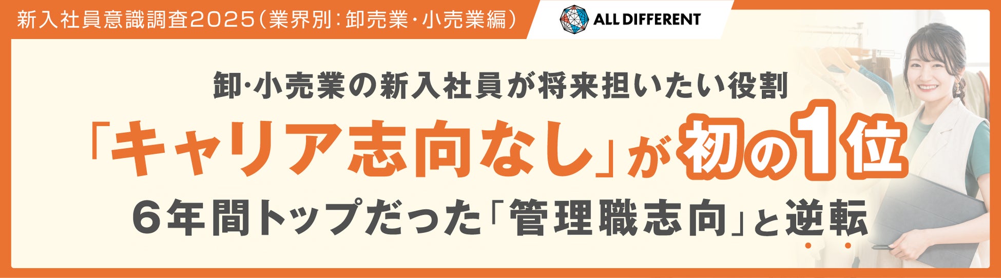 累計20,000社450万人以上の組織開発・人材育成を支援するALL DIFFERENT(オールディファレント)株式会社(所在地:東京都千代田区 代表取締役社長:眞﨑大輔)および「人と組織の未来創り🄬」に関する調査・研究を行うラーニングイノベーション総合研究所🄬は、3月25日~4月24日の期間で、2025年度新入社員を対象に「新入社員意識調査」を行いました。本リリースでは卸売業・小売業の新入社員の仕事に対する考え方などについて調査・分析した結果を公表いたします。