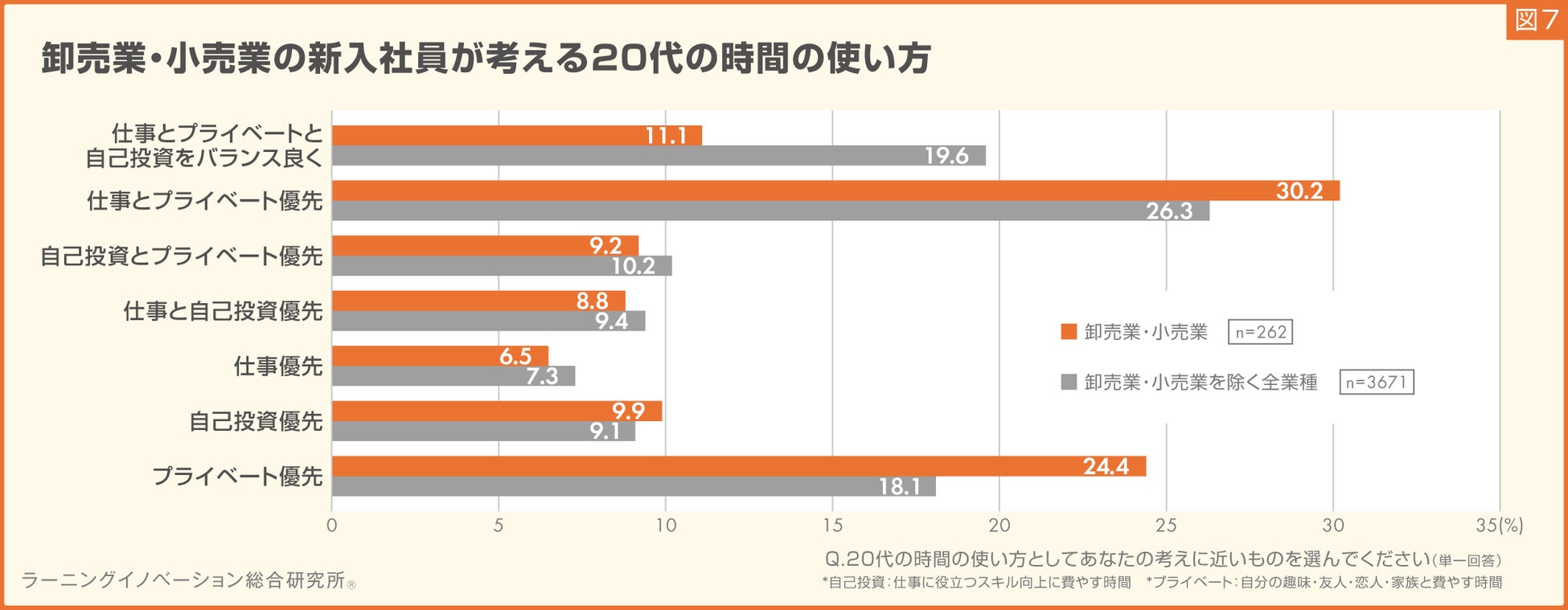 一方、「仕事とプライベートと自己投資をバランス良く」(11.1%)は他業種より8.5ポイント低くなりました(図7)。