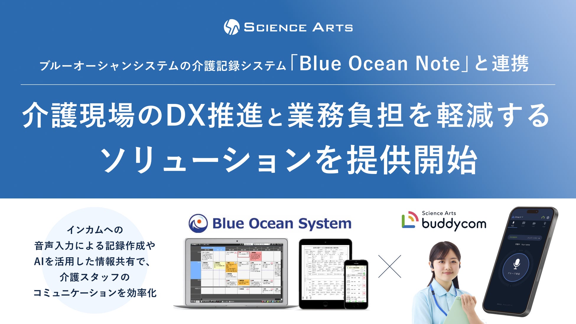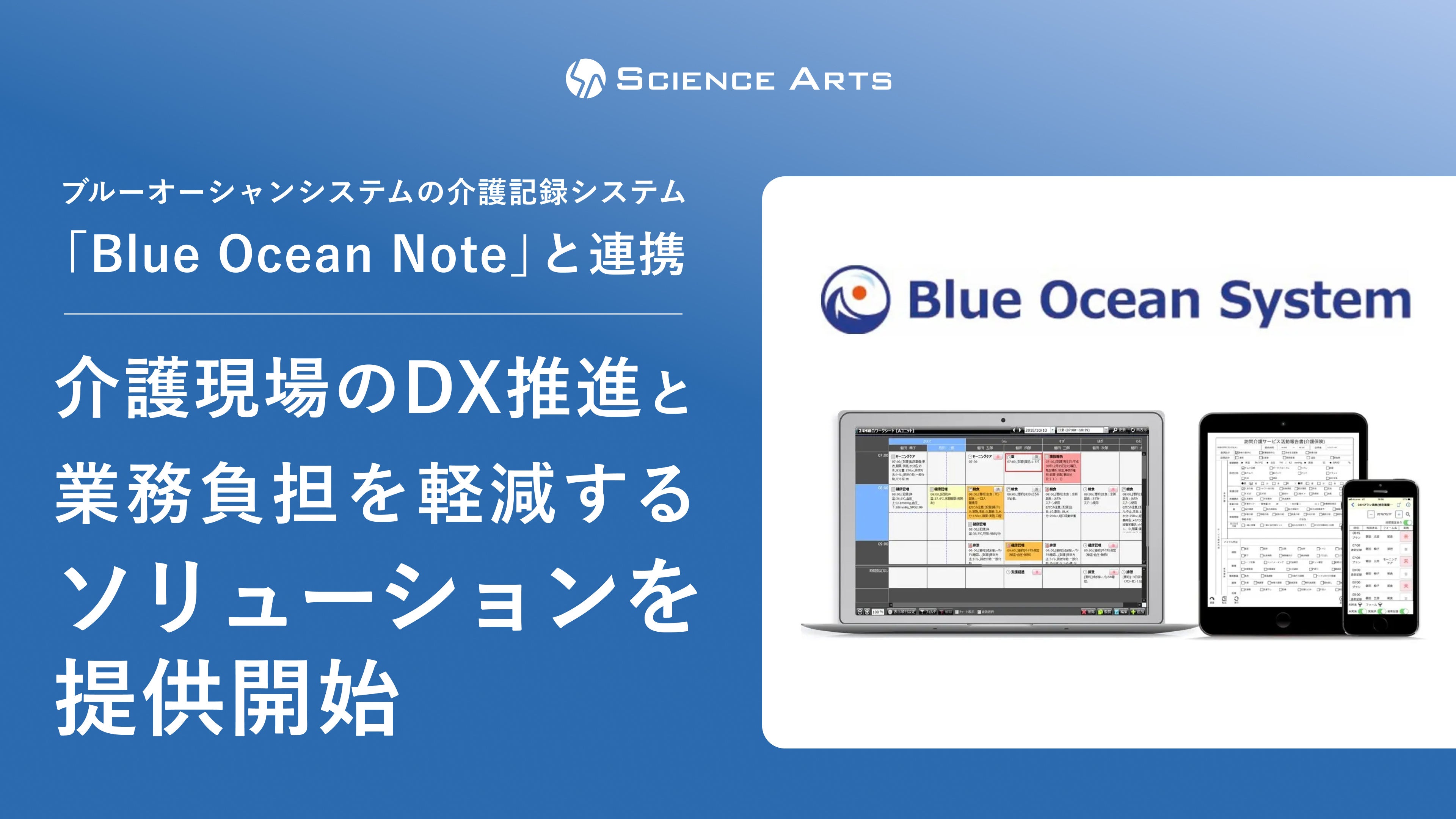 サイエンスアーツ、ブルーオーシャンシステムの介護記録システム「Blue Ocean Note」と連携し介護現場のDX推進と業務負担を軽減するソリューションを提供開始