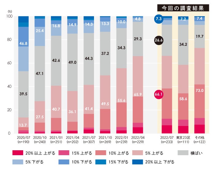 都区部では購入をためらうほど高いという回答が80%に達した.しかしながら今後もマンション価格が上昇するという回答も65%を超過.結果、購入意欲はコロナ前の水準まで回復
