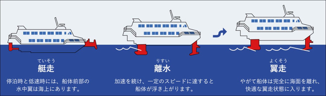 ジェットエンジンで海水を吹き出し空気のかわりに海水から揚力を得て飛ぶ「海のジェット機」 です。水中翼で海面から浮き上がって航行する為、船体への海水の抵抗が少なくなり、時速約80kmの高速航行を可能にし、波の影響も受けずほとんど揺れないので、船酔いの心配も解消しました。