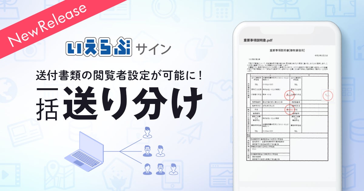 不動産テックに特化した業界垂直統合SaaS「いえらぶCLOUD」を提供する株式会社いえらぶGROUP(本社:東京都新宿区、代表:岩名 泰介、以下「いえらぶGROUP」)は、不動産業専門の電子契約システム「いえらぶサイン」にて、送付する書類ごとに閲覧者を設定できる「契約書送り分け」機能をリリースいたしました。