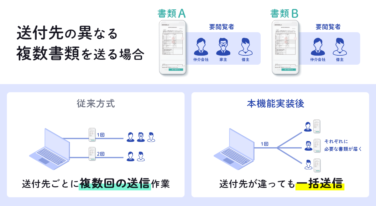 この度、いえらぶGROUPが、不動産業専門の電子契約システム「いえらぶサイン」において、「契約書送り分け」機能を実装したことによって、書類ごとに閲覧者が異なる複数の書類を、一度に送付することが可能となりました。不動産会社は、契約業務の効率化を実現するとともに、よりスムーズな取引体験を顧客に提供できます。