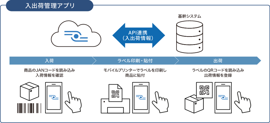 入荷、検品チェック・出荷ラベル印刷・出荷チェックの各工程作業をスマホ画面の操作で完結。