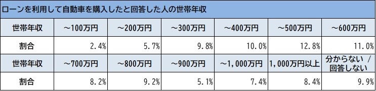 ローンを利用して車を購入した人の属性を見てみると、30~40代が多く、中でも40代は全回答者の40%以上となりました。また、世帯年収別に見ると「400万円~600万円」の回答が多い結果となりました。