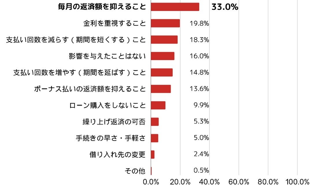 ローン経験者に、過去の経験から次回以降のローンで重視するポイントを聞くと、「毎月の返済額を抑えること」という回答が33.0%で最も多い回答となりました。近年は物価高騰しており、ローンの返済をしながら生活水準を保っていくためには月々の支払額を抑える必要があるという考え方が今回の結果に繋がったことが予想されました。