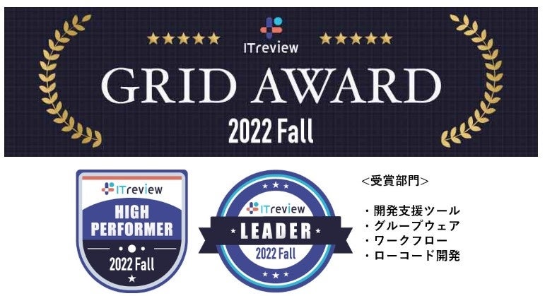 「ITreview Grid Award 2022 Fall」では、2018年10月~2022年9月までに掲載された約9.8万件のレビューをもとに、同一カテゴリーの中で満足度と認知度の高い製品を「Leader」、満足度が高い製品を「High Performer」として表彰しています。「ArielAirOne」は、開発支援ツール部門でLeader、グループウェア/ワークフロー/ローコード開発部門でHigh Performerを受賞しました。
