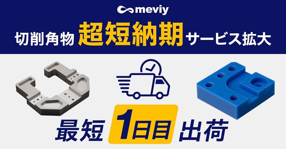 機械部品調達のAIプラットフォーム「meviy(メビー)」(サービス提供元:株式会社ミスミグループ本社)は、2025年4月22日より、切削加工(角物) (以下、切削角物)における「超短納期サービス」の対象を大幅に拡大しました。今まで対象だった9種類の材質・表面処理からステンレスやアルマイトなど24種類の材質と表面処理が新たに追加となり、合計33種類の材質・表面処理に対応しました。その中でも樹脂は業界トップクラスの最短1日目出荷を実現しました。