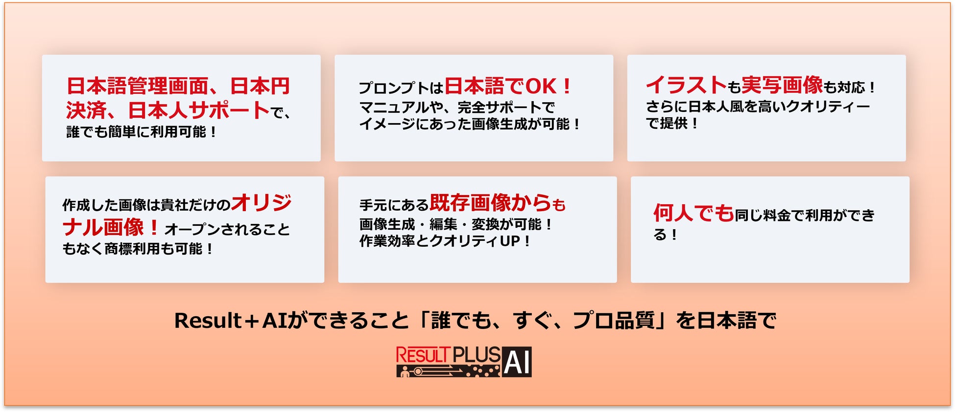 当社はこうした現場の声や自社での活用経験を踏まえ、個人から法人まで、誰でも簡単に日本語で扱え、クリエイティブ業務をしっかり支えられるサービスを目指し、業務提携を締結した株式会社ジーニーのグループ会社であるJAPAN AI株式会社のAIプロダクトを活用し、「Result+AI」を開発・提供するに至りました。