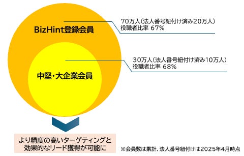 主なクライアントとなるSaaS企業からの要望が増加している、中堅・大企業に所属する会員数も累計30万人を超えました(※2)。また、法人番号やITシステム導入情報などBtoBマッチングの効率を高めるデータも拡充しています。2016年の事業開始以来、決裁権を持つユーザーの詳細情報を組み合わせたデータベースを構築し、クライアント企業のマーケティング成果を高めるべく実績を積み重ね続けたことで、「BizHint」はBtoBマッチング支援プラットフォームとして高く評価されるサービスへと成長しています。