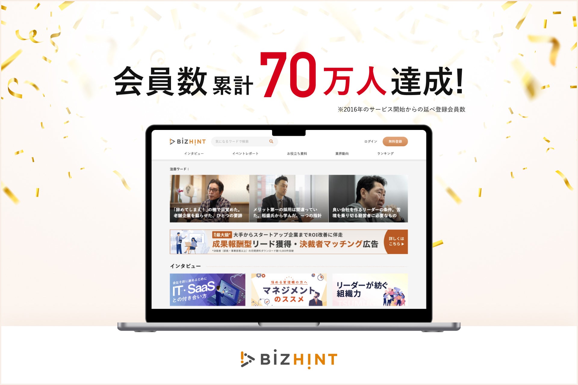 スマートキャンプ株式会社(本社:東京都港区、代表取締役社長CEO:林 詩音)のグループ会社である株式会社ビズヒント(所在地:東京都港区、代表取締役社長:関 哲)は、クラウド活用と生産性向上の専門サイト「BizHint(ビズヒント)」の会員数が2025年3月24日に累計70万人(※1)に達したことをお知らせします。