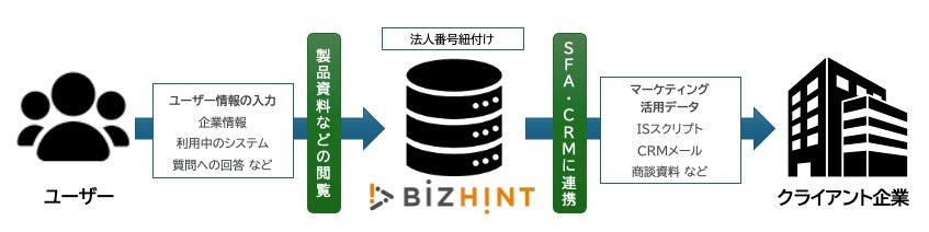 クライアント企業のBtoBマーケティング効率を高める重要データも拡充しています。SFA・CRM(※3)と連携する際に重複を防ぎデータ管理効率を上げるために有効な法人番号のほか、上場区分や利用中のITシステム名といった企業実態の把握につながるデータ群が、「BizHint」を介して一元的に収集可能となりました。これまで、クライアント企業がそれぞれにリソースを投じてヒアリングを行い、ユーザーは都度同じような回答を繰り返すといった非効率さが課題でしたが、両者のコストを削減し、最適なマッチング支援を促進しています。