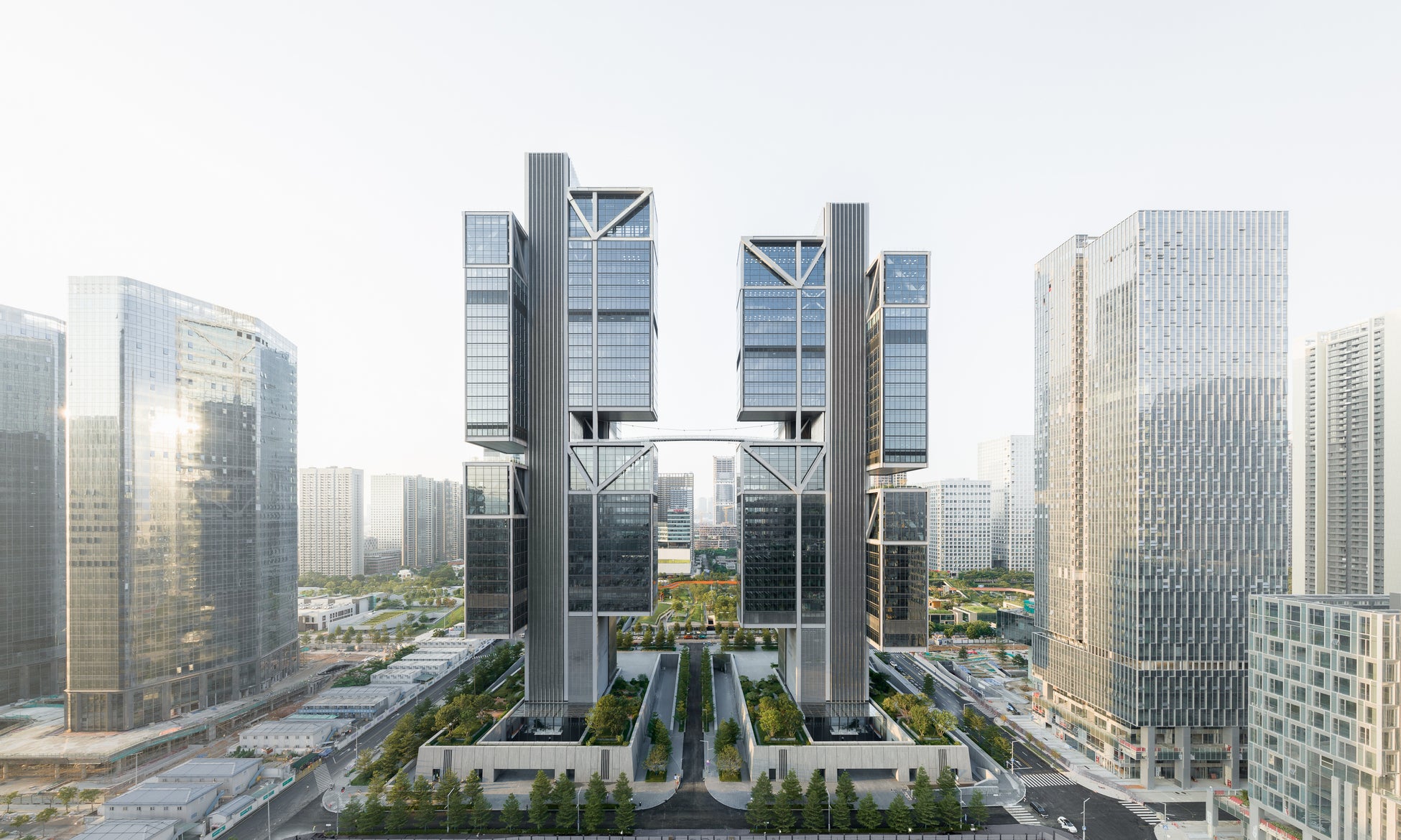 105メートルの高さを持つこのタワーは長さ90メートルの吊り橋で結ばれており、この軽量な鉄骨吊り橋が2つのタワーをエレガントに結びつけています。この橋は、DJIのすべての部門が共通の目標に到達するためにどのようにつながっているかを示すシンボルとして機能しています。