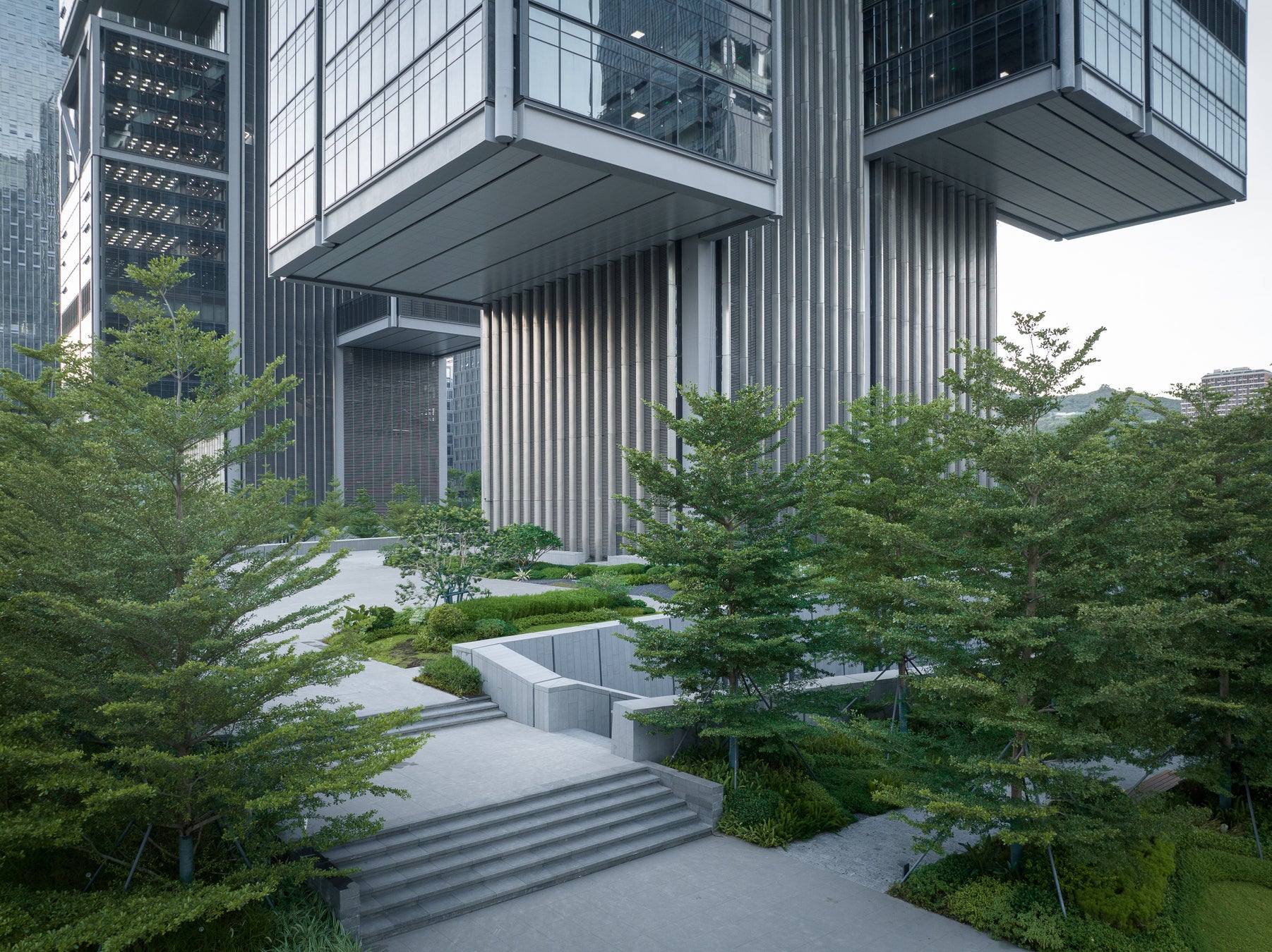 タワーエントランスからは DJI Sky Cityのワーキングスペースに対する実用的、美的、創造的なアプローチを垣間見ることができます。各ロビーには、禅の庭に囲まれた黒松が、版築の設計プロセスで作られた縞模様の壁を背景に展示されています。その結果、硬質な幾何学と起伏のある自然、明日の進歩と過去のルーツが調和し、互いに補完し合っているのです。