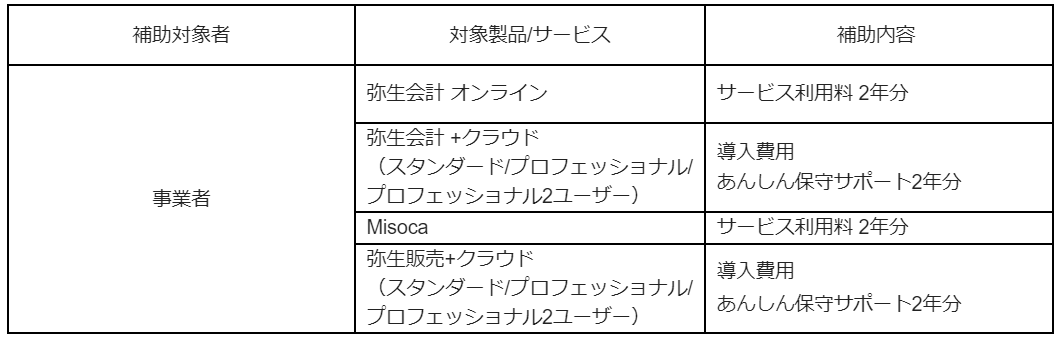 本年はインボイス制度に対応した会計ソフト、受発注ソフトなどが対象となる「インボイス枠(インボイス対応類型)」に該当し、「弥生会計」をはじめとした会計ソフトウエア、「Misoca」「弥生販売」を導入される際、導入費用および2年分の利用費に対して75%の補助を受けることができます。また、大きな変更点として導入する事業者が制度の定める小規模事業者※1である場合、最大80%まで補助率が拡大いたします。