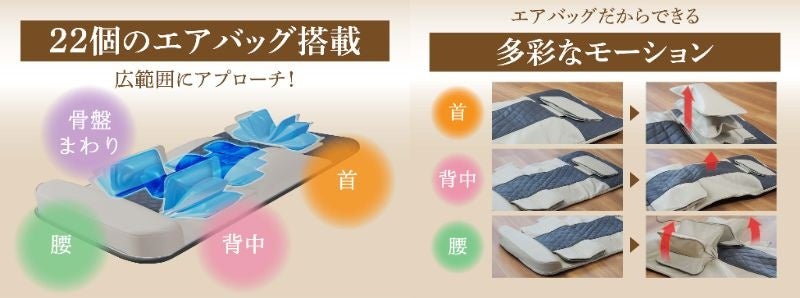 22個ものエアバックが3Dエアパワーシステムによって、多彩なモーションを可能にします。絶妙な力加減を再現することで「首・背中・腰」など広範囲にアプローチします。