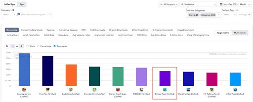 全ゲームジャンルでは、Bridge Raceは2022年に世界で最もダウンロードされたゲームトップ10の7位でした(data.ai調べ)
