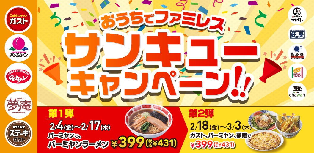 | 【おうちでファミレス サンキューキャンペーン おすすめポイント】 ① 和・洋・中!各ブランドの人気メニューをテイクアウト特別価格で 第1弾の目玉は、バーミヤンの「バーミヤンラーメン399円(税込431円)」! ガストでは家族でシェアできる大皿プレート、ジョナサンではクリスプチキン6ピースBOXなど各ブランドの人気メニューをラインナップ。 ② 全3回のお得なキャンペーン!人気メニューや新メニュー続々登場 2月18日(金)からは、3ブランドで399円メニューが登場するなど、対象ブランドやメニューを拡大! よりパワーアップする第2弾、第3弾にぜひご期待ください。 ③ 予約でGO!事前予約と決済で出来たてを待たずに”安心テイクアウト” アプリからのご注文がおすすめ!店頭の滞在も最小で安心して商品をお受け取りいただけます。 |