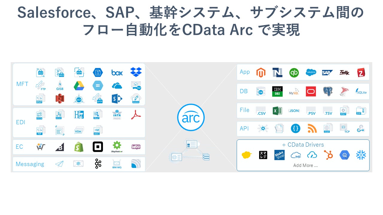 エンタープライズで利用されるSalesforce、SAP とスクラッチシステムの連携や連携サブアプリ開発による自動化促進を多様なコネクタとフロー自動化を行うCData Arc で実現