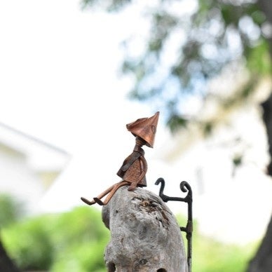 今にも動き出しそうな、銅で作られたこびとのオブジェ。生き生きとしたこびとと、流木を組み合わせた一点物のアート作品を制作。