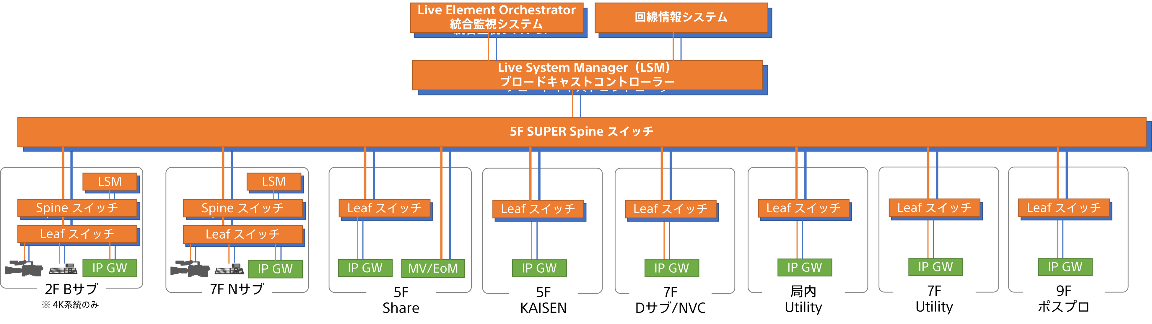 今回受注した回線システムは、「SMPTE ST 2110」を採用しています。朝日放送テレビ様では、既にBスタジオサブおよびNスタジオサブにてNetworked Live(ネットワークド ライブ)によるIPシステムを採用しており、今回受注したシステムは上記サブを含めた局内設備間を接続する回線システムとなります。