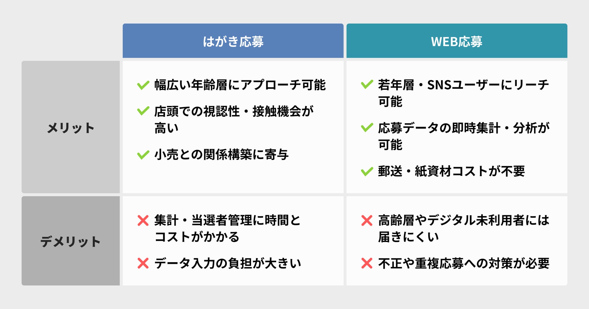 ただし、運営負荷は大きくなります。はがきとWEBでは応募データの形式が異なるため統合が必要になり、当選者の重複チェックや不正応募の防止、問い合わせ対応の一元化といった業務が複雑化します。効果は高いが、その分高度な運営体制が求められるのが実情です。