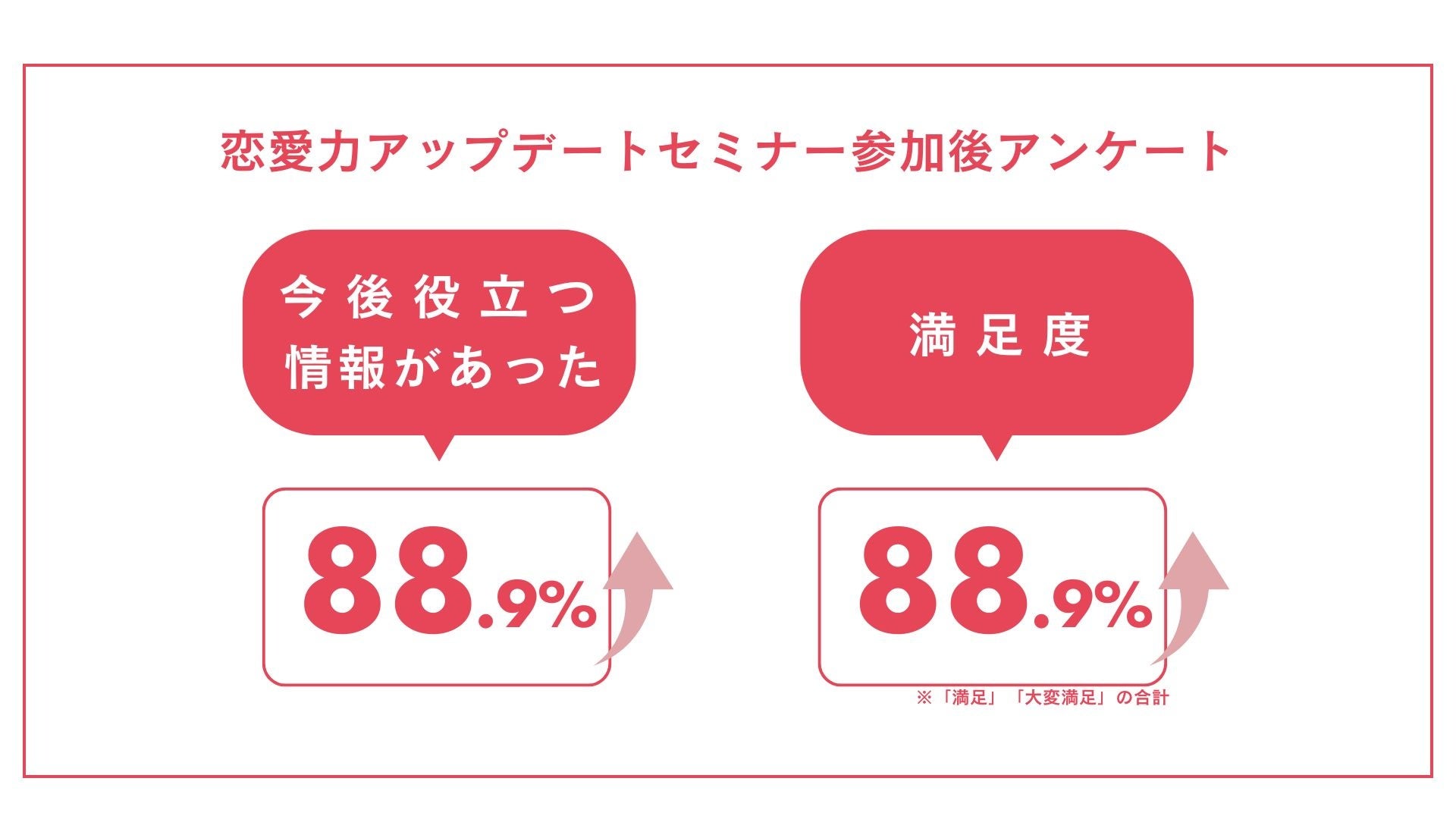 セミナー終了後のアンケートでは、満足度88.9%という高い評価をいただきました。また、「今後の婚活で役立つ情報はあった」との回答も88.9%にのぼり、参加者の意識変容(恋愛力アップデート)に大きく寄与したことが伺えます。