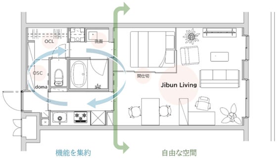 『ARTESSIMO Vuotα』は、水回りや収納という「機能」を一箇所に集約した間取りにより、居住空間の自由なレイアウトが可能となり、入居者のライフスタイルに合わせた柔軟な空間利用を実現するシリーズです。