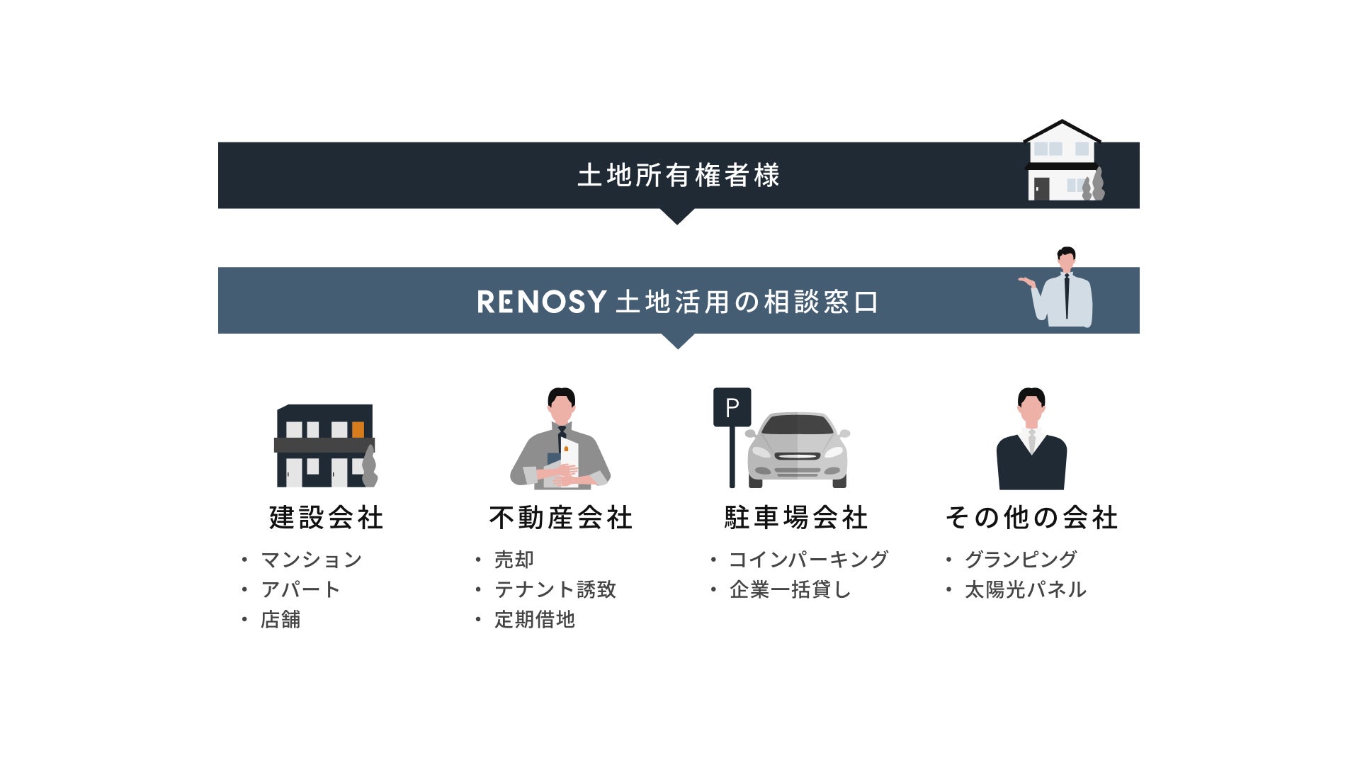 これらを踏まえて「提案で終わることなく、悩みの解決まで一緒に伴走してほしい」というニーズを満たすべく「RENOSY 土地活用の相談窓口」サービスを開始します。