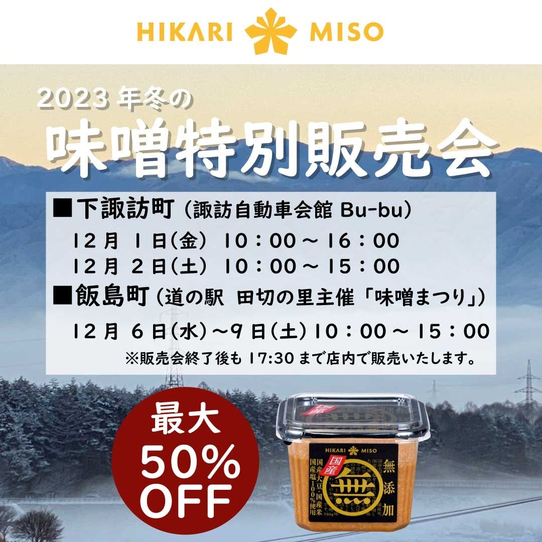 ひかり味噌󠄀株式会社(長野県諏訪郡下諏訪町、代表取締役社長 林善博)は、本社が立地する下諏訪町では12月1日(金)・2日(土)の2日間、工場が立地する飯島町では12月6日(水)~9日(土)の4日間、『冬の味噌󠄀特別販売会』を開催いたします。