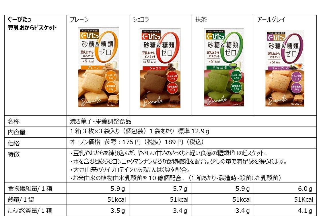 上図:左から「ぐーぴたっ 豆乳おからビスケット(アールグレイ/ディズニー・ショコラ/ディズニー・抹茶/ディズニー・プレーン/ディズニー)」
