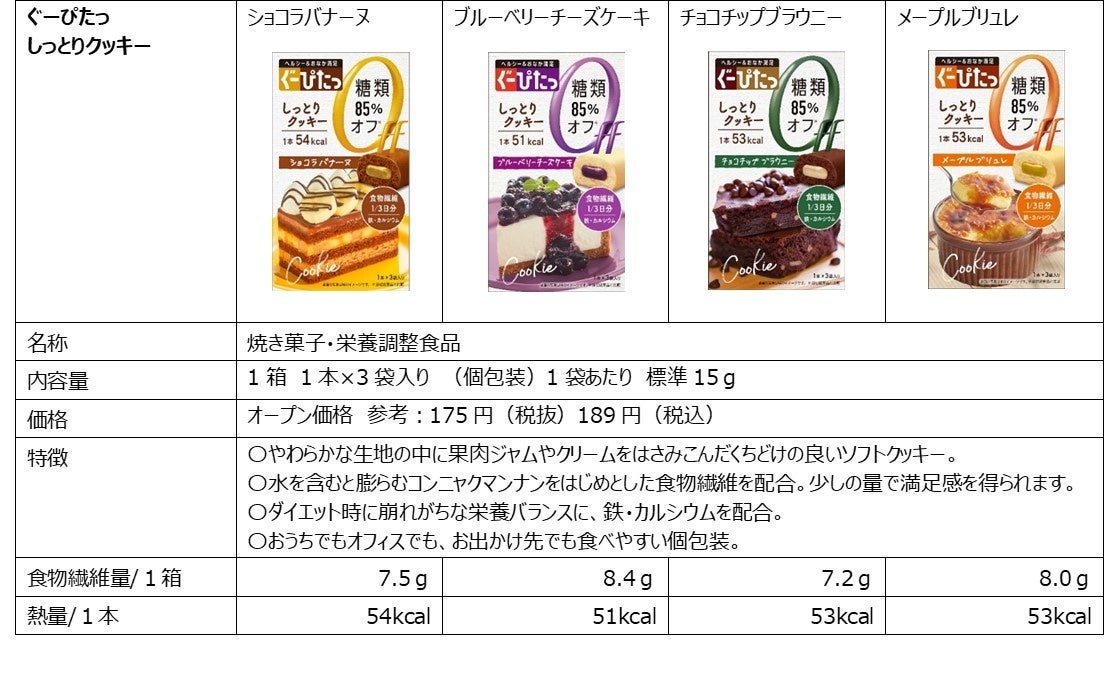 下図:左から「ぐーぴたっ しっとりクッキー(チョコチップブラウニー/ディズニー・メープルブリュレ/ディズニー・ショコラバナーヌ/ディズニー・ブルーベリーチーズケーキ/ディズニー)」