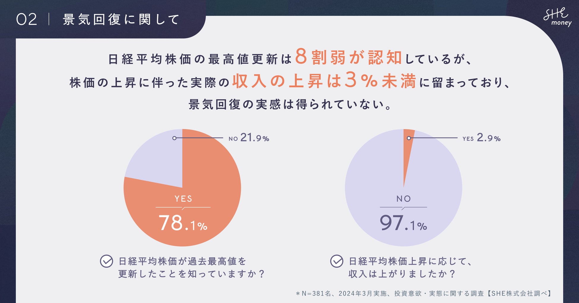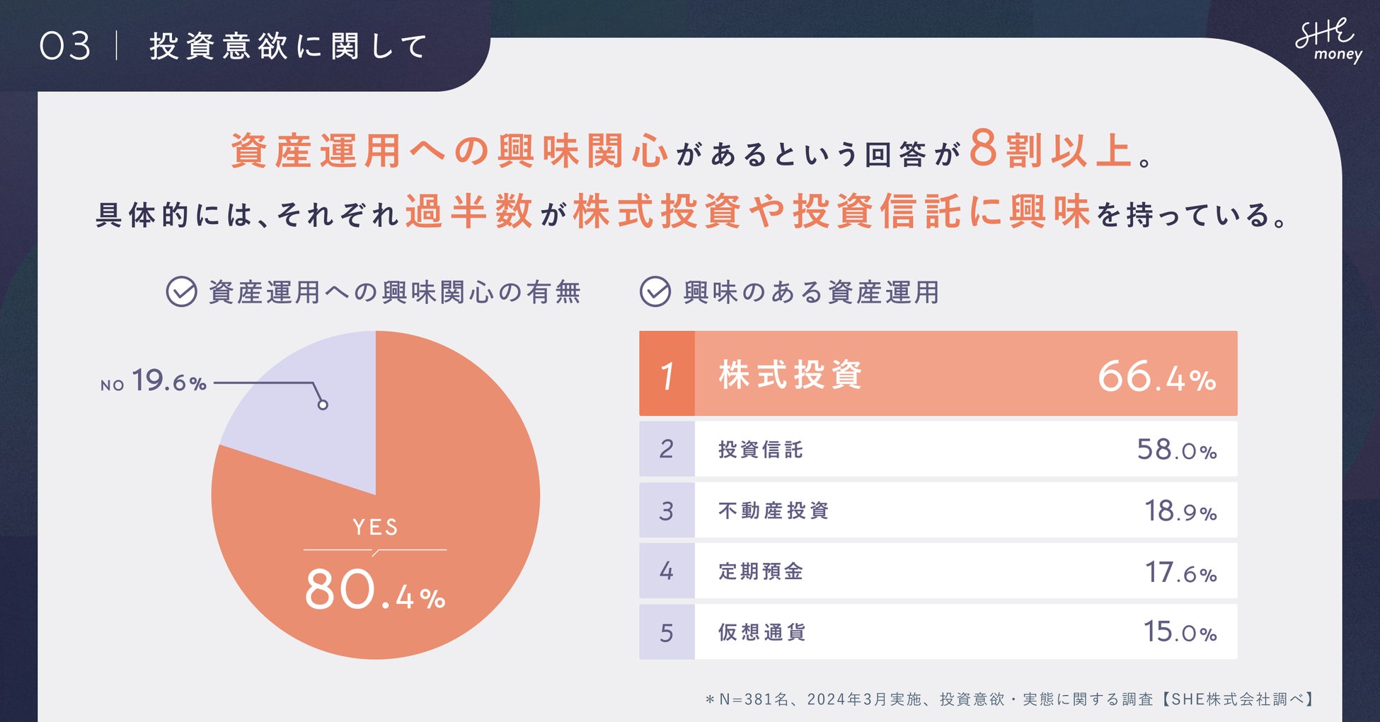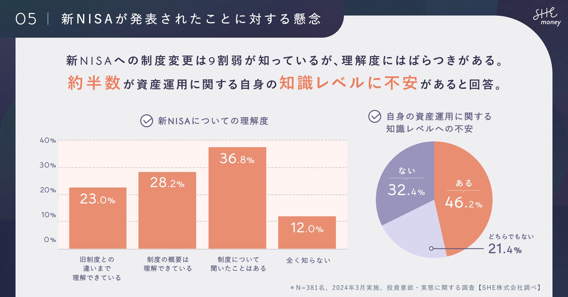 女性向けお金のコーチングスタジオ「SHEmoney(シーマネー)」を運営するSHE株式会社(所在地:東京都港区、代表取締役CEO/CCO:福田恵里、以下SHE)は、新NISA制度の開始や株式市場の盛り上がりなど、直近の金融・経済ニュースへの関心の高まりを受けて、ミレニアル女性を対象にした「お金に関する意識調査」を実施いたしました。