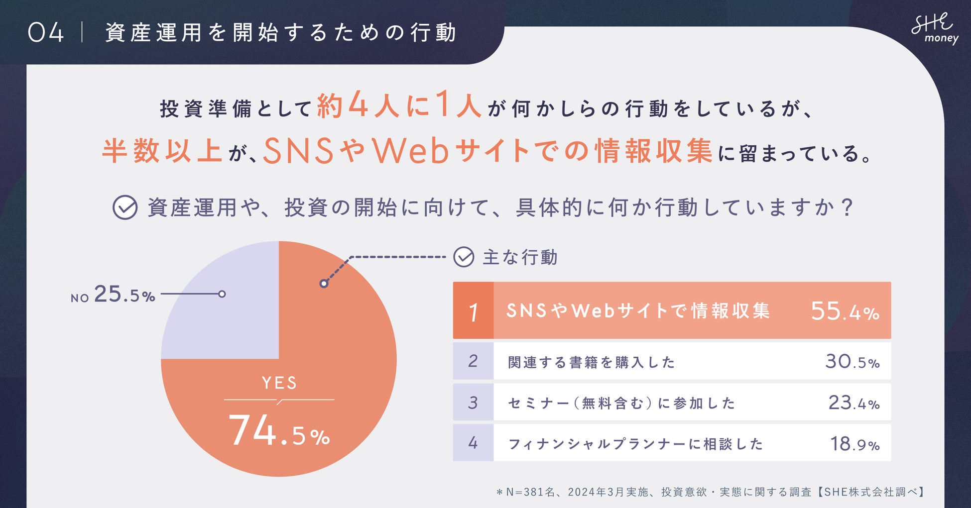 投資準備に約4人に1人が行動を起こしているが、半数以上がSNSやWEBサイトでの情報収集に留まっている。